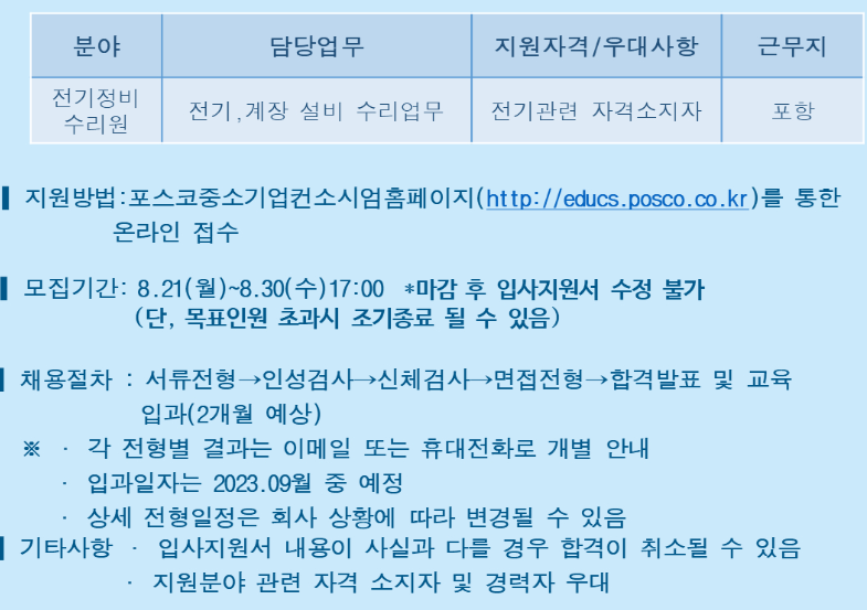 포스코PH솔루션은 포스코 그룹의 일원으로, 산업 설비 및 자동화 시스템 구축, 유지보수 전문 기업입니다. 특히, 포항 지역 경제 활성화에 기여하고 있으며, 안정적인 근무 환경과 복지 시스템을 제공하는 것으로 알려져 있습니다. 채용 방향은 전문성과 책임감을 갖춘 인재를 찾는 데 집중하고 있습니다.